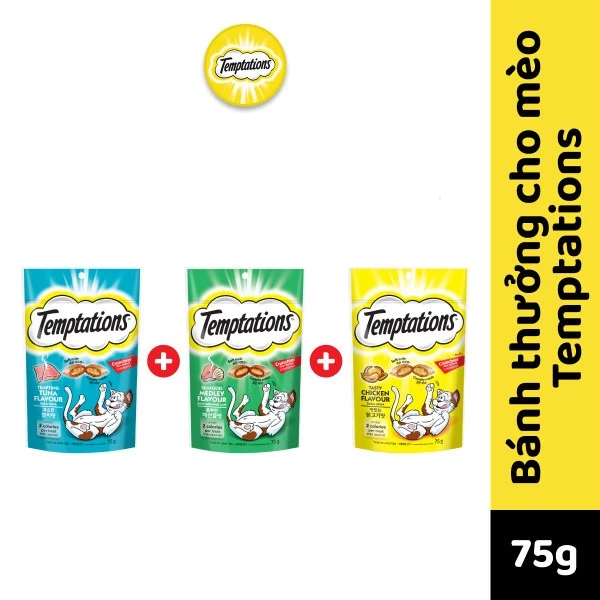 Xin giới thiệu TEMPTATIONS - Bánh thưởng cho mèo số 1 thế giới, thơm ngon và bổ dưỡng, phù hợp cho mèo lớn từ 1 tuổi trở lên. Mỗi sản phẩm bánh thưởng dành cho mèo đều có kết cấu kép độc đáo, là kết hợp hoàn hảo giữa vỏ ngoài giòn rụm và nhân bên trong mềm mịn, chắc chắn là món ăn yêu thích của bé mèo. Với ít hơn 2 calo mỗi bánh, bạn có thể thoải mái cho mèo ăn khi chúng đói mà không sợ ảnh hưởng đến sức khỏe của chúng.Bánh thưởng cho mèo Temptations có ba hương vị hấp dẫn: