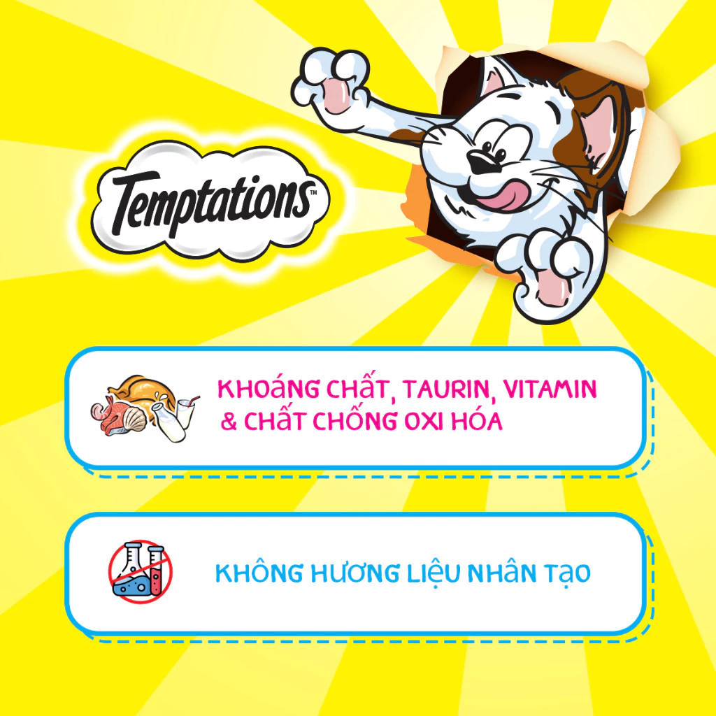 Mở ra một thế giới đầy hương vị và sự phấn khích cho mèo cưng của bạn với Bánh Thưởng Cho Mèo TEMPTATIONS. Hương vị hấp dẫn, kết cấu độc đáo và lợi ích dinh dưỡng hoàn hảo khiến TEMPTATIONS trở thành lựa chọn tối ưu để nuôi dưỡng và chiều chuộng bé mèo của bạn. Vậy bạn còn chờ gì mà không lắc túi và chờ đợi ngắm nhìn đôi mắt của bé mèo sáng lên với niềm vui sướng!