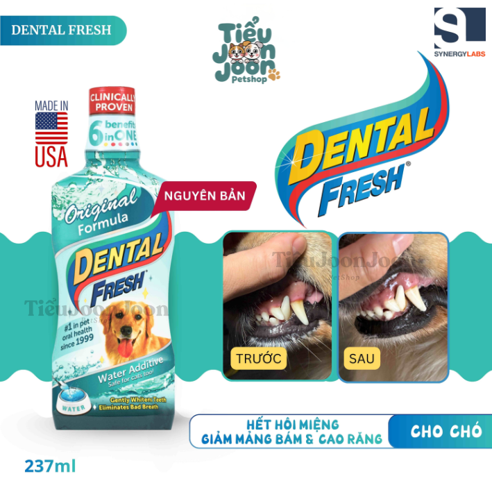 - Pha một nắp đầy Dental Fresh vào khoảng 240ml nước trong bát nước của thú. Hoặc theo hướng dẫn của BSTY.