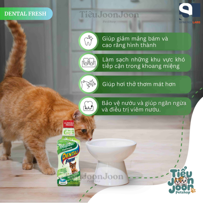 - Pha một nắp đầy Dental Fresh vào khoảng 240ml nước trong bát nước của thú. Hoặc theo hướng dẫn của BSTY.