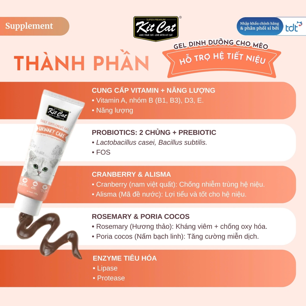 Kit Cat Daily Supplement Gel Urinary Care là gel bổ sung dinh dưỡng kết hợp với hỗ trợ điều trị và phòng ngừa nhiễm trùng đường tiết niệu cho mèo - có thể dùng hằng ngày hoặc trong các trường hợp mèo bị thiếu chất/suy dinh dưỡng/cần hồi phục sau bệnh.