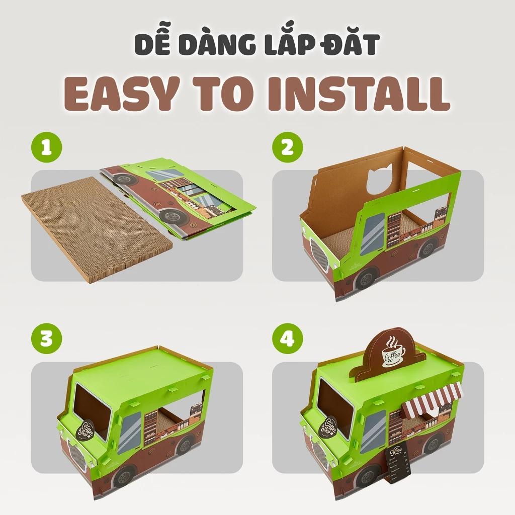 - Hộp nhà carton cào móng cho mèo với thiết kế đáng yêu hình xe buýt cà phê. Không gian bên trong lớn, thoải mái cho mèo lăn lộn, vui chơi đồng thời cũng là nơi "trú ẩn" an toàn cho bé. Chất liệu carton đan xen nhiều lớp dày dặn, bền bỉ chịu được lực cào cắn mạnh của mèo. Kết hợp decor không gian phòng