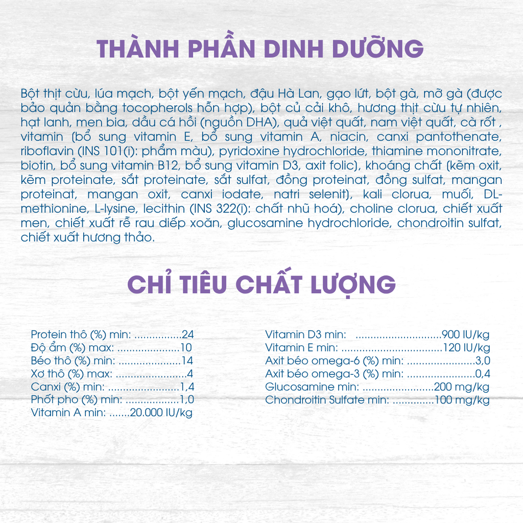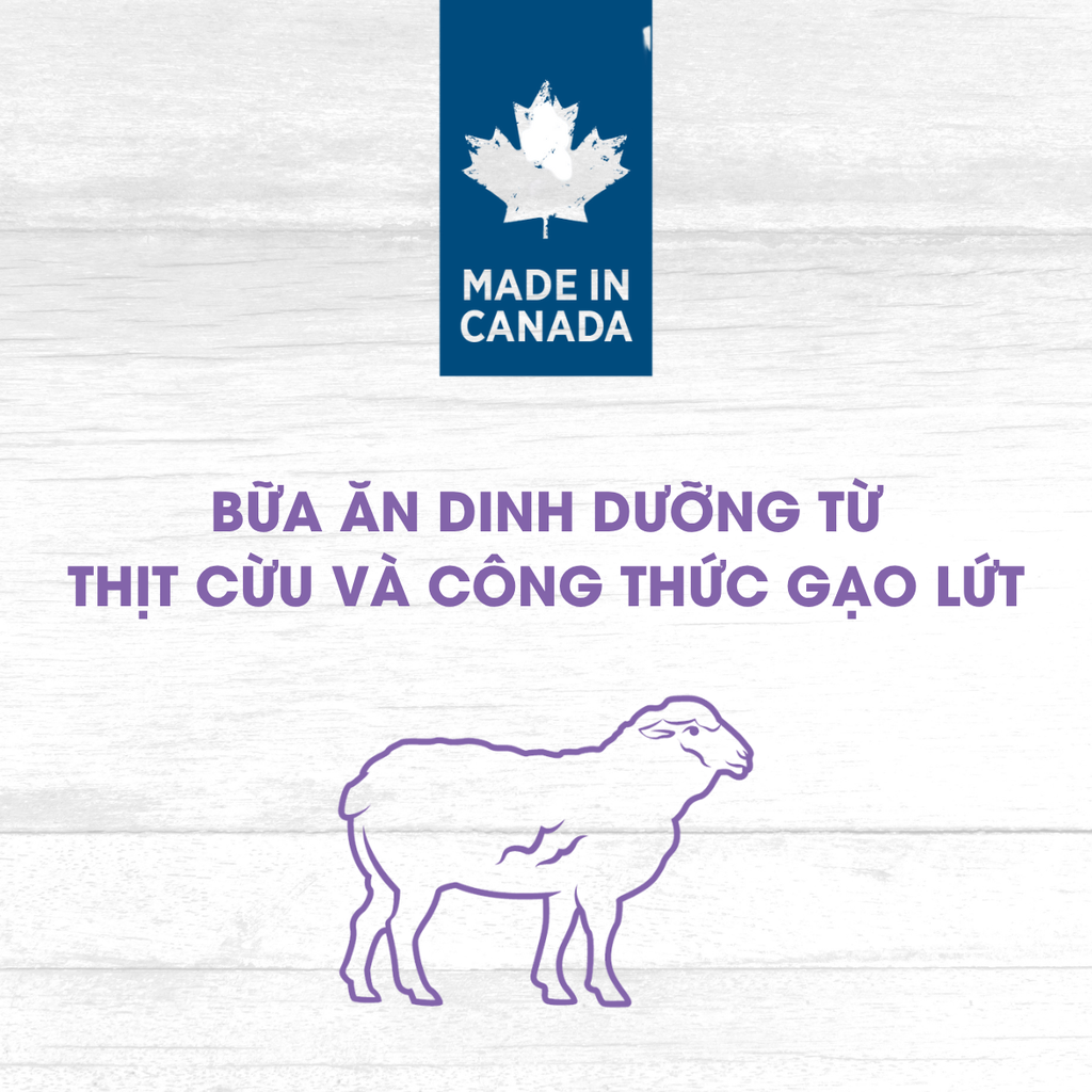 THÀNH PHẦN DINH DƯỠNG: Bột thịt cừu, lúa mạch, yến mạch, đậu hà lan, gạo lứt, bột thịt gà, mỡ gà (bảo quản bằng tocopherol hỗn hợp), cùi củ cải khô, hương thịt cừu tự nhiên, hạt lanh, men bia, dầu cá hồi (nguồn DHA), việt quất, nam việt quất, cà rốt.