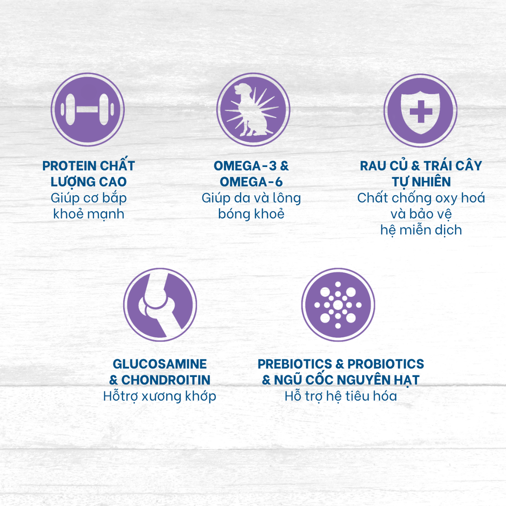 Công thức bổ sung các nguồn chất chống oxy hóa quan trọng (việt quất, nam việt quất, cà rốt cùng với vitamin C & E) hỗ trợ hệ miễn dịch và duy trì trái tim khỏe mạnh cho chó.