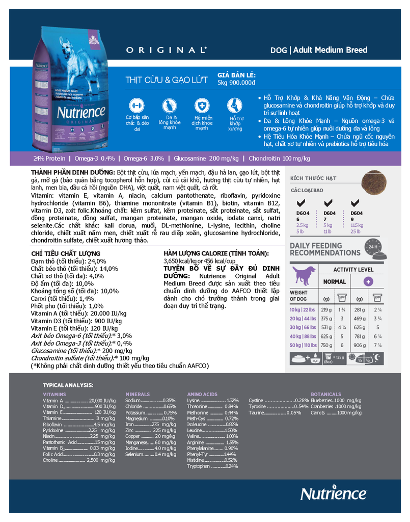 Công thức Nutrience Original Adult Medium Breed, Lamb & Brown Rice được sản xuất để đáp ứng các mức dinh dưỡng do AAFCO Dog Food Nutrient Profiles thiết lập dành cho chó trưởng thành trong giai đoạn duy trì thể trạng.