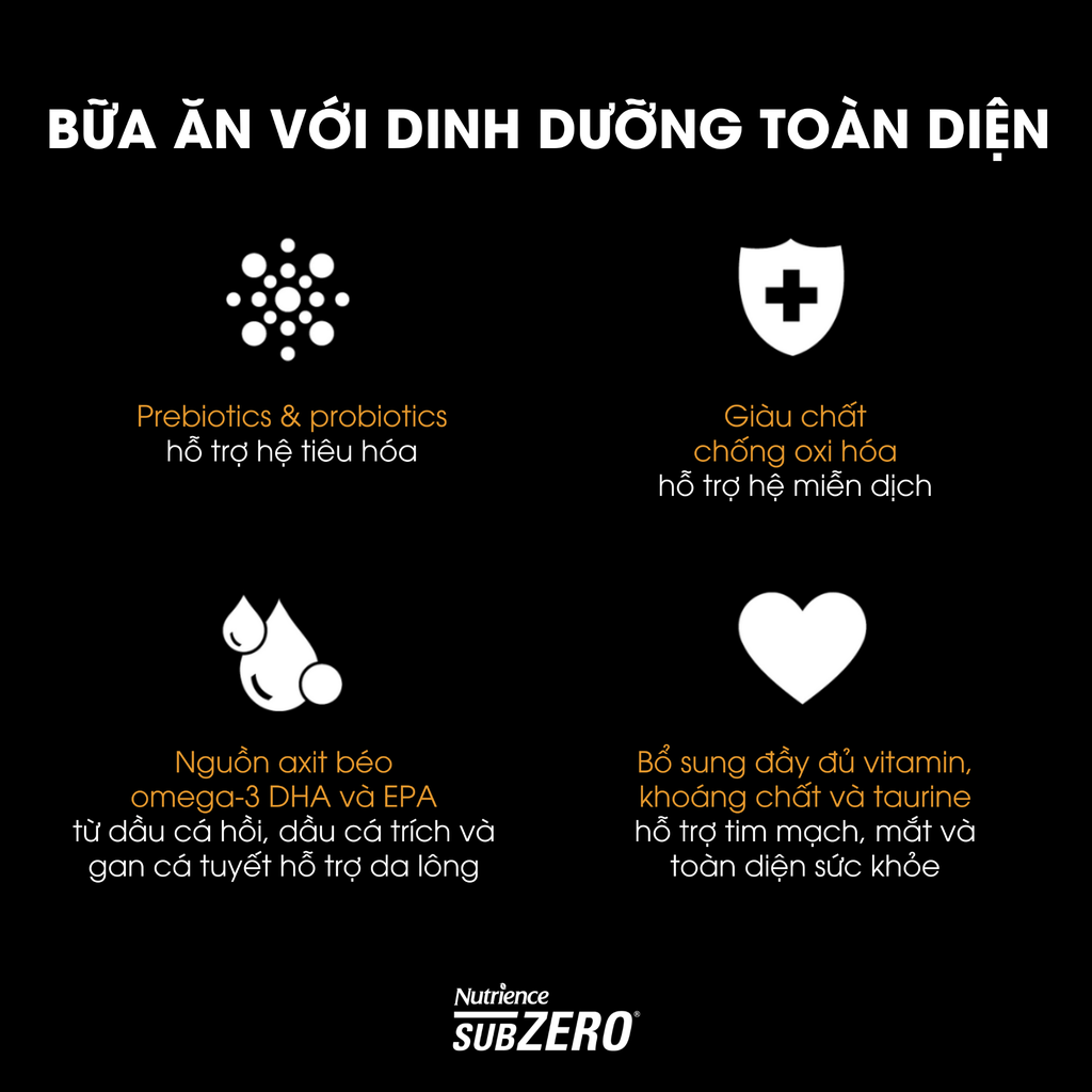 Sản phẩm Nutrience Subzero Fraser Valley cho Mèo phù hợp cho tất cả giống mèo ở mọi giai đoạn phát triển. Lượng thức ăn mà chú mèo cưng của bạn yêu cầu phụ thuộc vào kích thước, tuổi tác, mức độ hoạt động và môi trường. Chỉ cần bắt đầu theo hướng dẫn của chúng tôi, điều chỉnh khi cần thiết và đảm bảo luôn có sẵn nước sạch cho mèo.