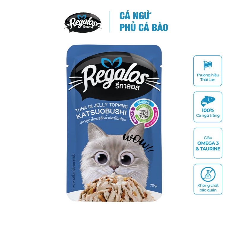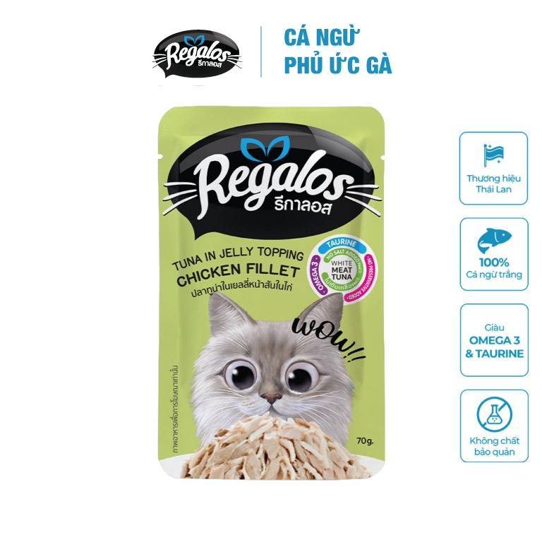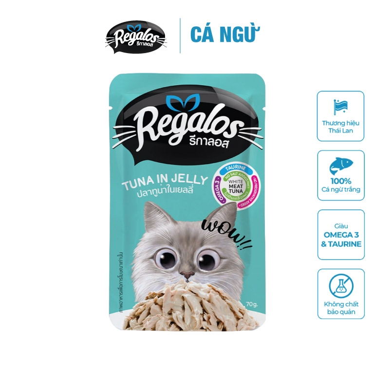 Thức ăn ướt Regalos cho mèo là pate cao cấp được tuyển chọn nguyên liệu 100% cá ngừ trắng thơm ngon nhất theo tiêu chuẩn dùng cho người giúp cung cấp dưỡng chất thiết yếu, hỗ trợ cho quá trình phát triển của mèo cưng