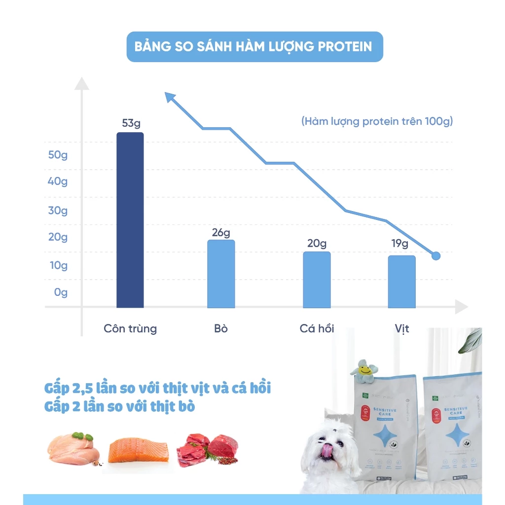 Sản phẩm sử dụng nguồn đạm côn trùng cao cấp, giàu axit amin thiết yếu, dễ tiêu hóa và ít gây dị ứng, là lựa chọn lý tưởng cho chó có cơ địa nhạy cảm với các nguồn Protein truyền thống như thịt gà hay bò.