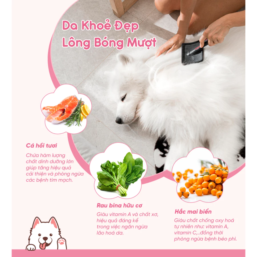 Hàm lượng Omega dồi dào từ cá hồi giúp nuôi dưỡng da, làm mượt lông và giảm tình trạng rụng lông, thích hợp cho thú cưng có vấn đề về da, lông.