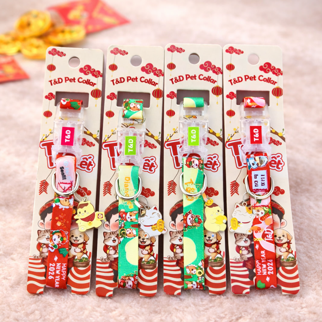 Vòng cổ thú cưng Tết 2026 là phụ kiện không thể thiếu giúp boss chó mèo nổi bật, xinh xắn và mang ý nghĩa may mắn đầu năm mới. Thiết kế mang phong cách Tết truyền thống, phối màu đỏ – xanh – vàng rực rỡ, in họa tiết linh vật và biểu tượng tài lộc, cực kỳ hợp không khí Xuân.